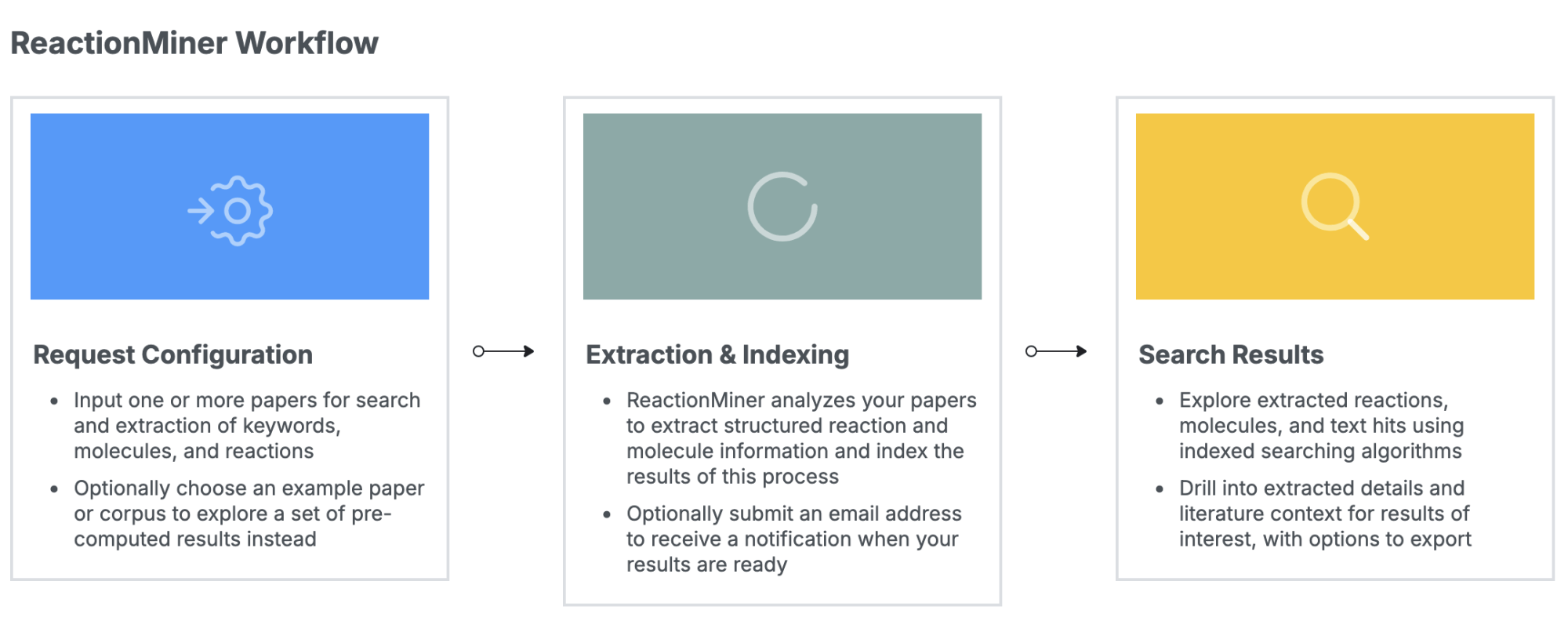 ReactionMiner searches reaction descriptions in PDF documents using text and chemical structures provided as SMILES/SMARTS strings. Extracted reaction records associated with passages can also be browsed and exported. This tool combines LLM-based reaction extraction tools with our lab's ChemScaper tools, linking molecule names in text with their appearance in diagrams, and mutli-modal search for molecules and/or text. Users are able to upload their own PDF for extraction and search.